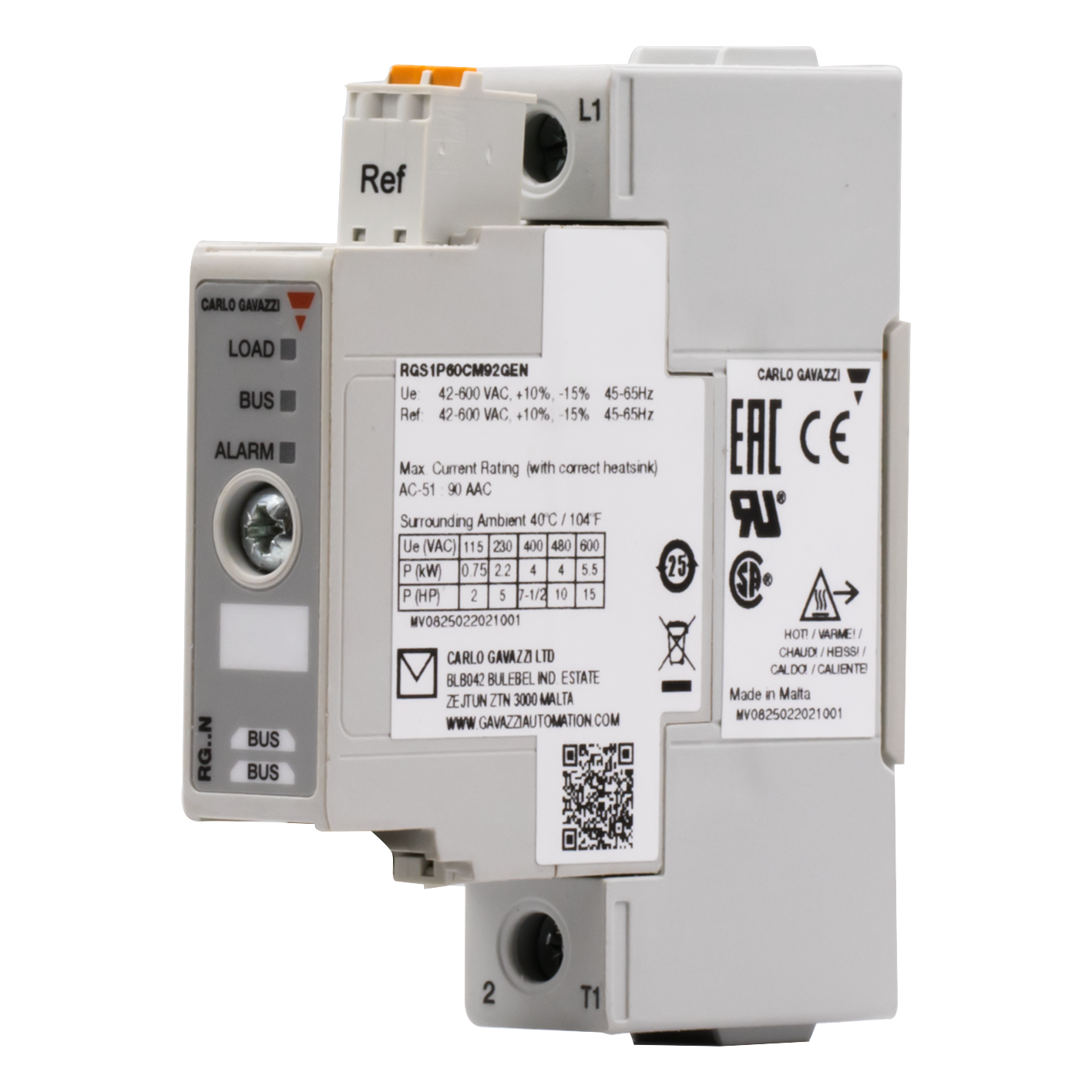 1-pole panel mount SSR, Proportional control switching via bus interface (NRG), Real-time data (A, V, W, Hz, kWh, Hrs) and monitoring, Operating voltage (Ue): 42 - 660 Vac (1200 Vp), Rated current (Ie): 90 Aac, Built-in overvoltage protectionSpecifikationer